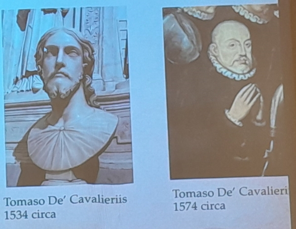 La prima notizia e’ fornita da Giorgio Vasari nella sua “Vite” 1568: “…..Fece ancora per Messer Tommaso de’ Cavalieri, gentiluomo romano, innamorato della sua virtu’ e della sua bellezza, infiniti disegni divinissimi….”. Il cinquantasettenne Michelangelo fu preso da un colpo di fulmine per il diciottenne Tomaso de’ Cavalieri. Questa passione senile, non solo fonte d’ispirazione artistica, proseguirà nel tempo e Tomaso sarà, alla morte dell’artista, anche il suo esecutore testamentario.