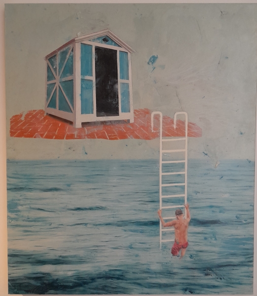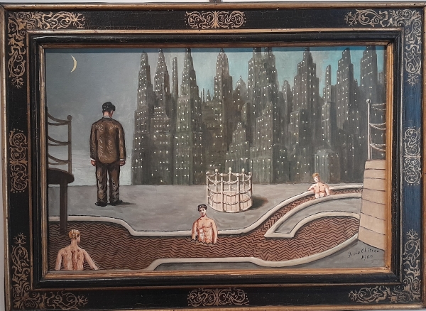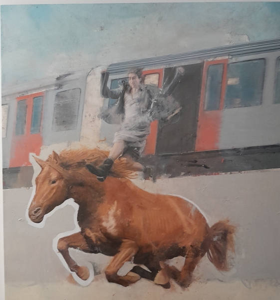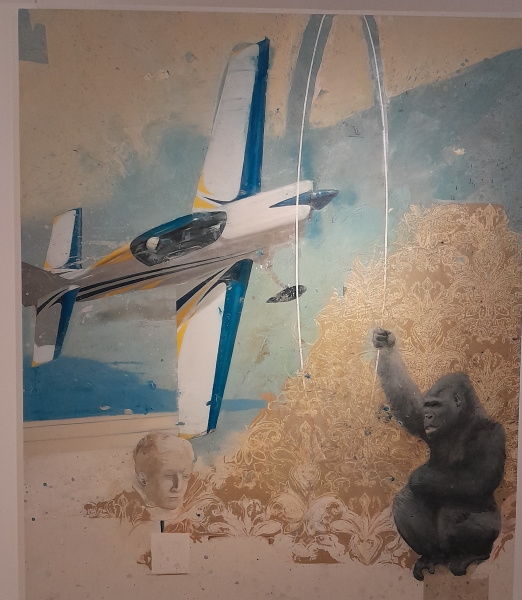 Da comunicato stampa: “Nicola Pucci è un pittore italiano di fama internazionale, noto per il suo realismo visionario e surreale. Nelle sue opere la tecnica figurativa si combina a contesti onirici, decontestualizzazioni e presenze animali, con un forte impatto emotivo e narrativo. L’origine palermitana del pittore viene sottolineata dal curatore per una ragione affine alla filosofia del progetto, ovvero identificare l’energia unica di zone ad alta connotazione culturale, come il capoluogo siciliano, dove sono cresciuti molti pittori della generazione qui rappresentata, lungo visioni che hanno trasfigurato il reale con ironia, espressività, apparente leggerezza e senso morbido del tragico…..A dialogare con le opere della Collezione Cerasi, in un incontro su cui i visitatori sono chiamati a riflettere, sono diciannove quadri dell’artista Pucci. Tra questi alcuni della serie degli aerei (es. “Aereo con Gorilla”, “Aereo cerchio III” e “Aereo cerchio IV”), della serie degli animali (“Salto cavallo bianco su treno”, “Salto cavallo bianco su treno II”, “Galli coppia 1”, “Galli coppia 2”, “Galli coppia 3”) o ancora le opere che esplorano l’incontro tra il mondo umano e quello animale (“Ragazza con toro e rose”, “Donna con toro giallo”,,“Leone con bambino III”, “Bambino con cane I”) fino ad arrivare a “Cabina magica” del 2026, che richiama immediatamente alla memoria “I bagni metafisici” di De Chirico.